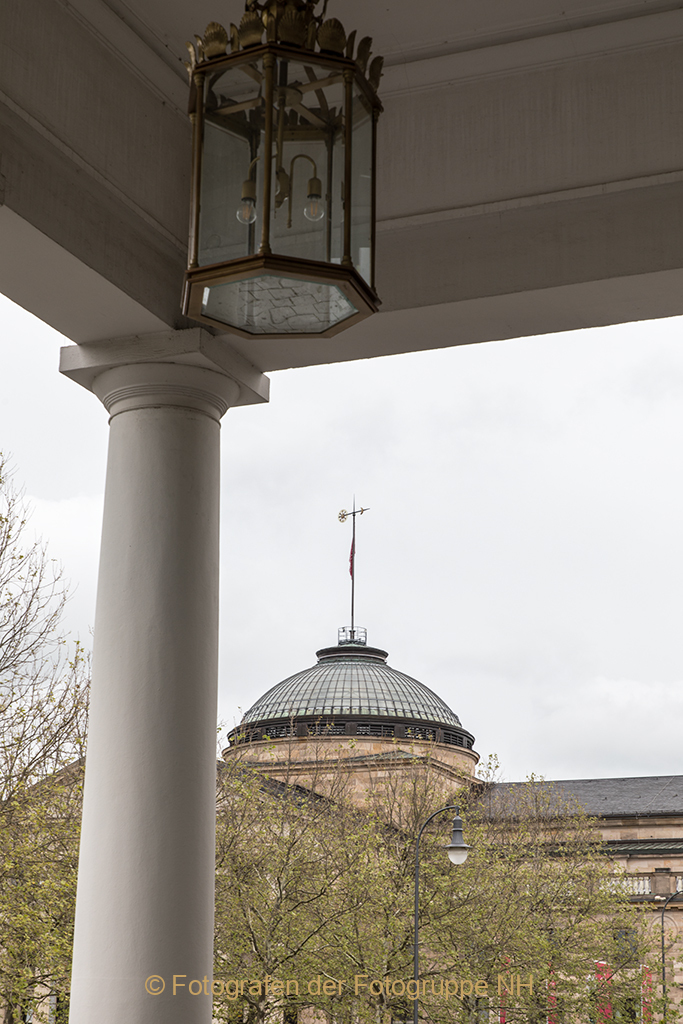 Ein Blick zurück auf die Kuppel des 1907 eröffneten neuen Kurhauses und weiter geht’s. Auf einem Hügel in der Ferne weist uns ein gemauerter Turm den Weg.