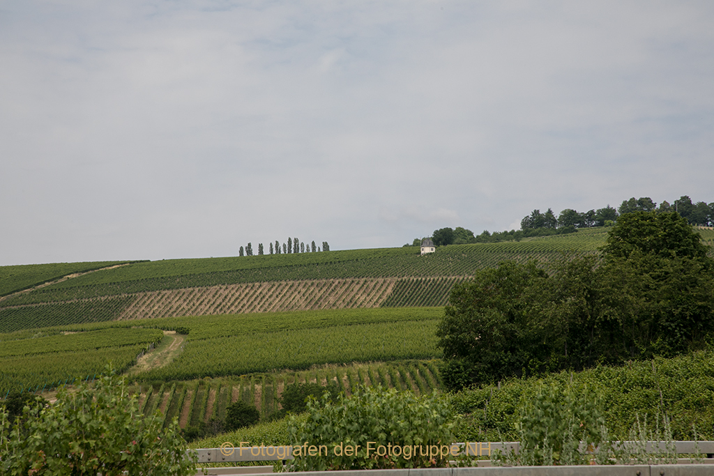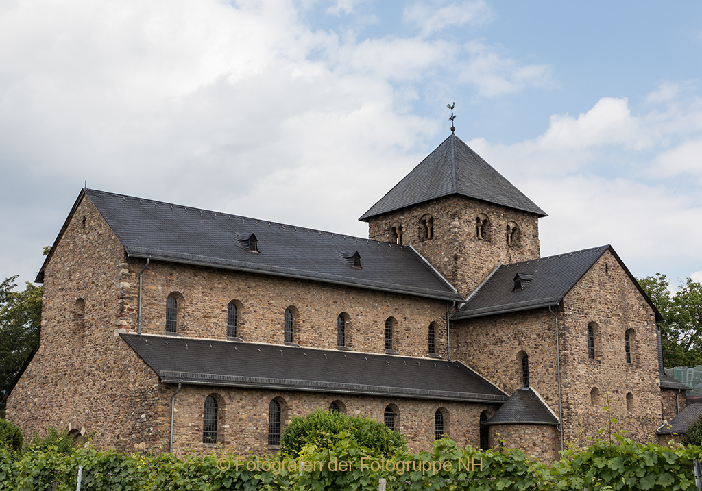 Geschwind fahren wir zurück. Die Rebstöcke reichen hier bis hinunter zur Straße. Den Kran haben wir jetzt zur Linken. In Mittelheim ist die dreischiffige romanische Basilika aus dem frühen 12. Jahrhundert nun viel besser zu erblicken. Weiter geht es an den gepflegten Fachwerkhäusern des Rheingaus vorbei, zurück über die Hügel des Hohen Taunus.