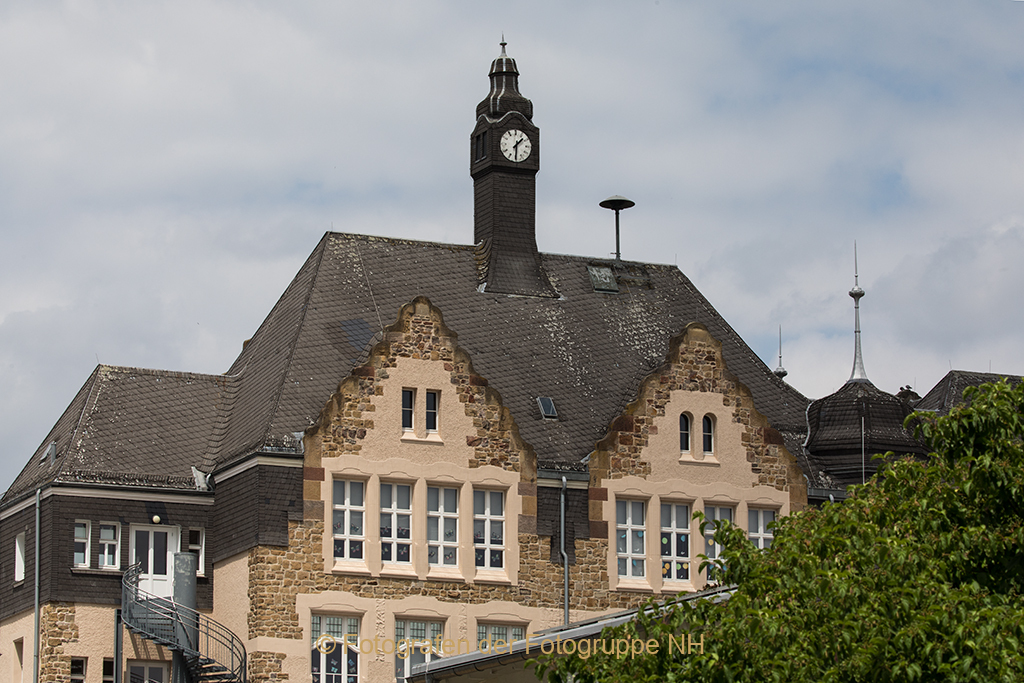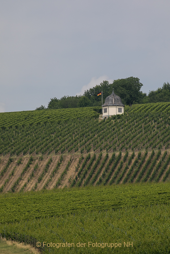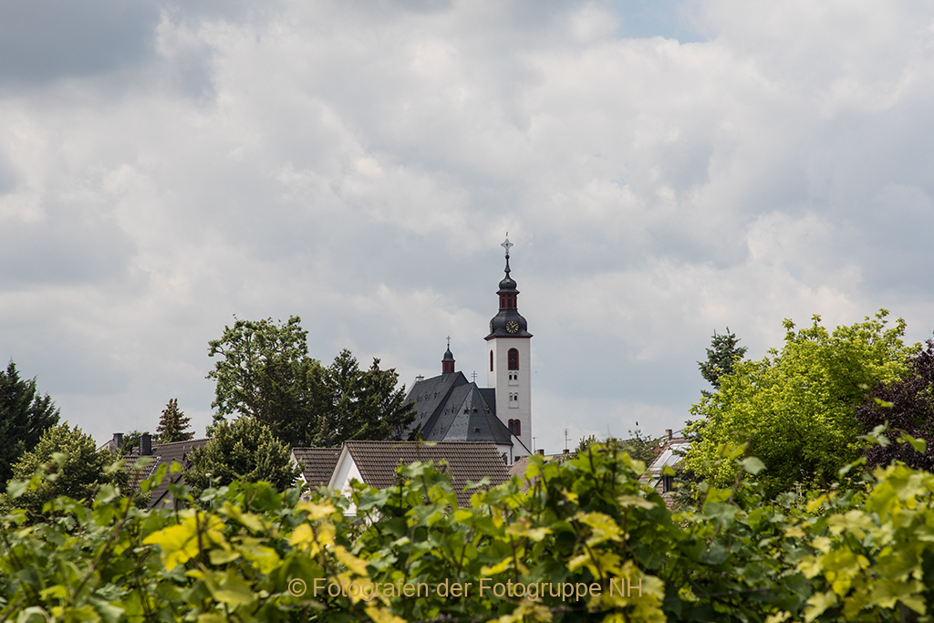 Über den grünen Blättern des neuen Weines ist der grazile Kirchturm von Winkel schon zu erkennen. Von da ist es nicht mehr weit, bis zu unserem Ziel, dem Glockenturm der Schule unserer beiden Enkelkinder.