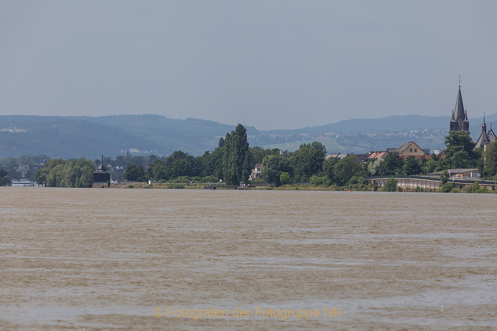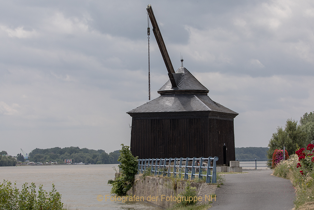 Ganz in der Nähe zeichnet sich zur linken Hand die dunkle Silhouette der nächste Landmarke am Ufer des Flusses ab, der Oestricher Kran von 1745.