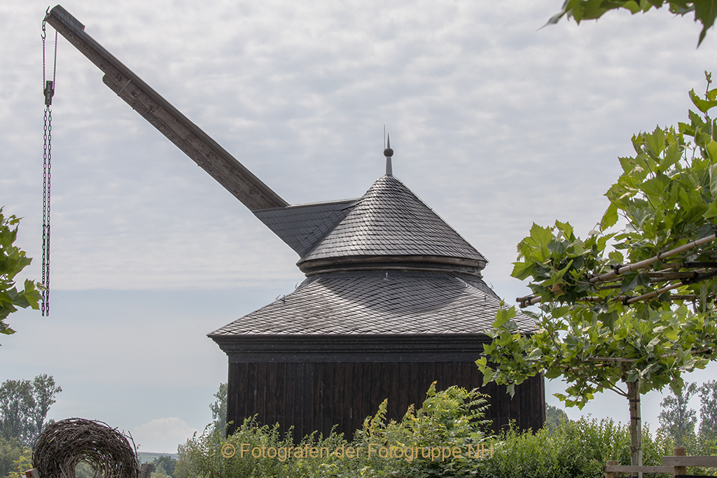 Angetrieben von der Beinkraft mehrerer Männer, die wie die Hamster in einem Laufrad den Kran antrieben, wurden die Weinfässer vom Ufer auf die hölzernen Kähne gehievt.