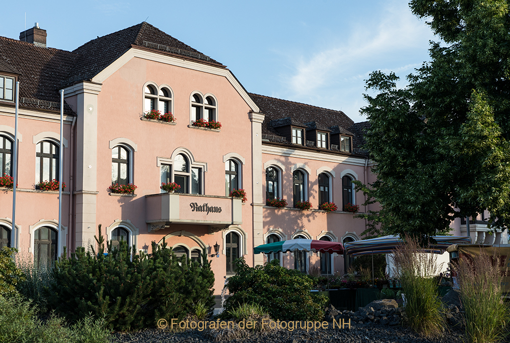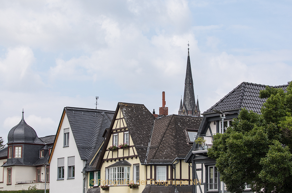Wir folgen der Uferstraße und sehen auf der rechten Seite den ältesten Gasthof des Rheingaues. Das Hotel Schwan wurde 1628 erbaut. Der schiefergedeckte Oestricher Kirchturm ragt über die Dächern der Häuser hinaus.